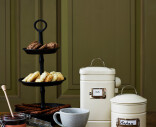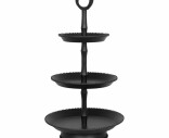 Tårtfat / kakfat i tre våningar med dekorativa prickiga kanter. Handtag högst upp för lätt förflyttning.