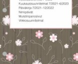 Koko 92 x 168 mm; 18 kuukautta; viikko aukeamalla; päiväkirja 27/2021-1/2023; vuosisuunnitelmat 2021-2023; kuukausisuunnitelmat 7/2021-6/2023; liputuspäivät Suomessa; suomenkieliset nimipäivät; viikkosuunnitelmasivuja.