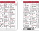 äytännöllinen, kestävä ja lompakkoon mahtuva. Koko 100 x 70 mm, puoli vuotta puolellaan. Liputuspäivät, kansalliset pyhät, nimipäivät, kuun vaiheet. Pyöristetyt kulmat, mittaviivoitus, laminoitu kartonki. Suomenkielinen.