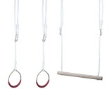 Perfekt lekset till härligt aktiva barn. Settet till redskapsgymnastiken innehåller en trapets i skönt avrundat trä samt 2 romerska ringar i metall med gripyta. Monteras upp i träd eller på gungstativ med det medföljande rep. Krokar för upphängning inår ej i förpackningen.