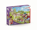Vagn till Stora Hästshowen är en underbar liten transport som tar dig till hästshowen. Hästvagnen är utsmyckad med hästskor, fjärilar och vitklöver och Clara har också smyckat grimman till sin Connemara ponny. Det följer med en mjuk picknick filt och en välfylld picknickkorg som står på den praktiska hyllan på ryggen på hästvagnen. Clara sitter mjukt och bekvämt på filten under hästshowen och myser med sin chihuahua-valp och njuter av gott mellanmål.