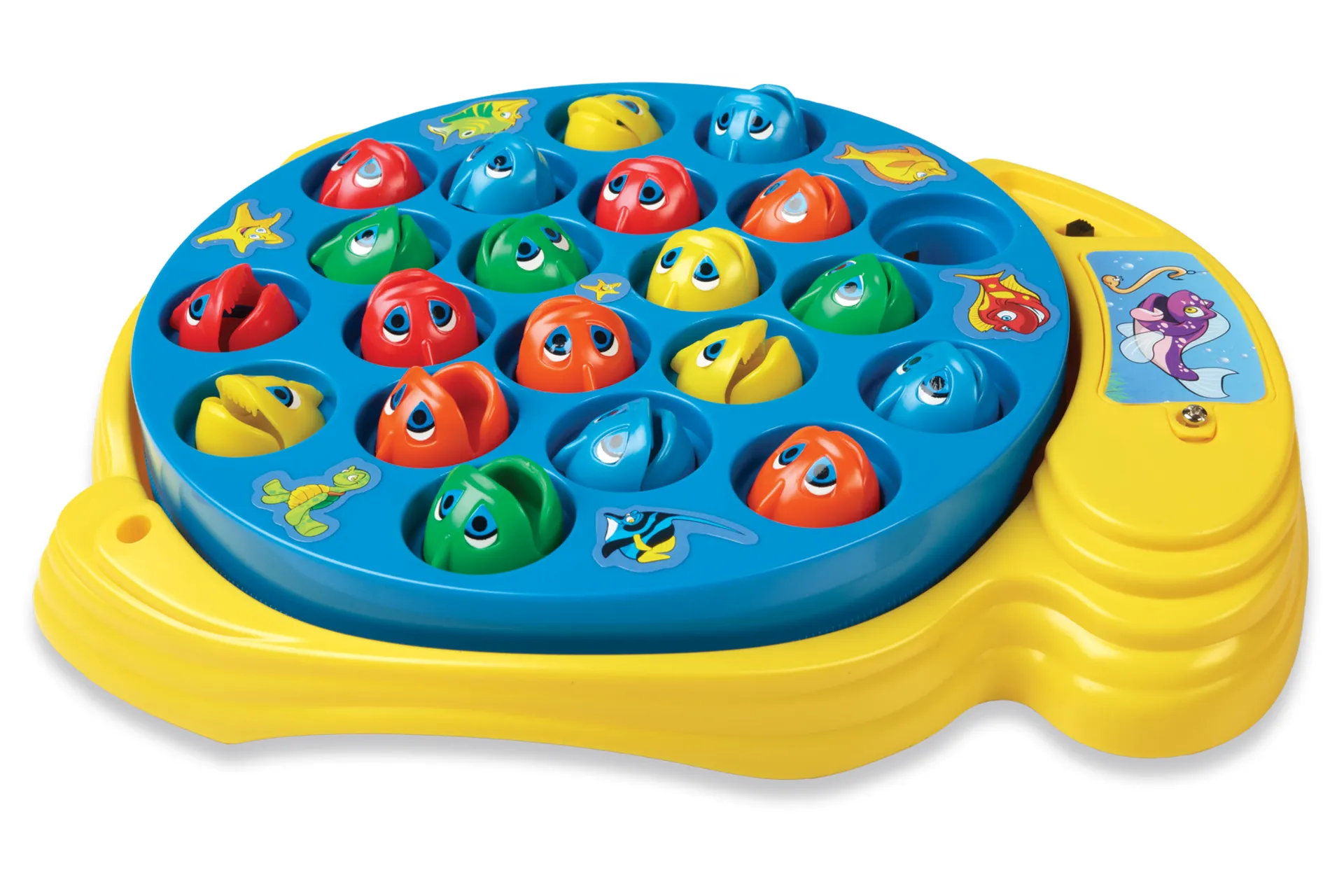 Vem har bäst fiskelycka idag? Fånga fiskarna från det roterande spelbrädet. Den som fångar flest fiskar vinner! Innehåller 21 fiskar och 4 metspön. För 1-4 spelare. Batterier (1 x C) ingår ej. 3+