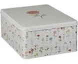 Rymlig rund ask i plåt med lock. Mönstret är blandade sommarblommor. Burken är fast off-white inuti och idealisk för förvaring av torrvaror, kakor eller bakverk. Ett charmigt och funktionellt tillskott till köket.