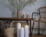 Ett vitt ljus i plast, passar för utomhusbruk. Ljuset går att använda både med ljussensor och med timer. Önskar man sensor så sätts brytaren på ON läget, ljuset lyser då upp när mörkret faller. Sätter man brytaren på timer i stället så lyser ljuset i 6 timmar, sedan slocknar den i 18 timmar och lyser upp nästkommande dag igen. Ljuset är 25 cm höjd och lågan är ca 2,5 cm. diameter 10 cm. Ljusfärg: varmvit. IP44. Integrerad LED 0,13W. Fungerar med tre AA-batterier som ingår ej. Ljusrelä/timer 6 h på, 18 h av, repeterande.