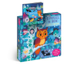Solen går ner och det blir tyst och stilla. I de myllrande illustrationerna på pusslen finns det många spännande djur att titta på. Vilka djur ser du?  I den medföljande boken får du läsa om vad det är för ljud man kan höra om natten.