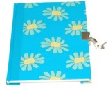 Vacker dagbok A5 med lås och två nycklar. Turkos bakgrund och motiv av små solrosor. 128 linjerade sidor.