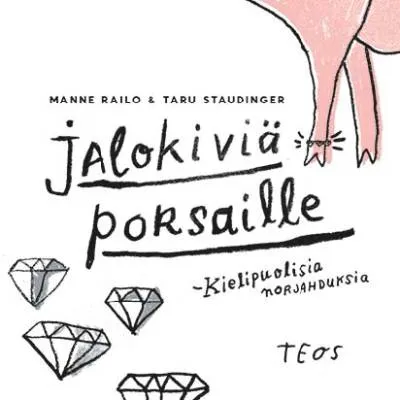 Kaikki ovat olleet tilanteessa, jossa pitäisi turvautua idiomiin. Tiedättehän: ”puhua puuta heinää”, ”menettää kasvonsa” tai ”helmiä sioille”. Hiukkasen niitä omia päälauseita värittämään tai muuten vain asiaa jalostamaan. Mutta vähänkin vieraalla kielimaaperällä liikuttaessa saattaa idiomista spontaanisti tulla ihan uusi sutkaus. Kuten ”jalokiviä porsaille”, tämän kirjan nimi ja alkusysäys. Alkuperäisen kyllä tunnistaa, mutta paljon maukkaammalta se uusi tuntuu. Kirjaan kootut uudet idiomit ovat peräisin täysin autenttisesta lähteestä. Uuden kieliperinteen tallentaja, Manne Railo, alkoi kirjoittaa muistiin suomenruotsalaisen ystävänsä norjahtaneita tokaisuja huomatessaan niiden aiheuttavan eteenpäin kerrottuina pitkiksikin venyneitä sydämellisen naurun remakoita. Kun ihan varmaa ei aina ole, mitä kaikkea uudet sutkaukset tahtovat sanoa, ne on viisainta kuvittaa. Työhön ryhtyi kuvittaja ja graafikko, esikoisteoksellaan Svenskspråkig Bokstävercock absurdin tajunsa kerralla todista