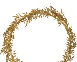 Lyxig julkrans att hänga mot en väggen eller i fönster. Kransen har guldglitriga löv som är tillverkade av polyeten. För inomhusbruk.