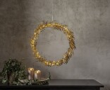 Lyxig julkrans att hänga mot en väggen eller i fönster. Kransen har guldglitriga löv som är tillverkade av polyeten. För inomhusbruk. Ljusfärg: varmvit. IP20. 50 x integrerad LED, total effekt 0,5W. Medellivslängd ca 7 000 h. Fungerar med 3 x AA-batterier som ingår ej. Timer 6 h på, 18 h av, repeterande. Avstånd mellan lampor: 2 cm.