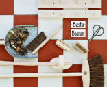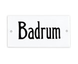 Plåtskylt i emaljfinish med texten "Badrum". Två alternativ för upphängning; antingen med medföljande dubbelhäftande etikett eller med spik i skyltens två hål.