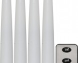 4p Flamme antikljus i höjden 20cm, med slät yta och en låga som ger ett naturtrogen sken och utseende. Fjärrkontroll ingår. Max 5 set (20 ljus) kan styras av samma fjärrkontroll. Avstånd max 5m. Ljusfärg: Varmvit IP20. Integrerad LED 0,03W, 10 mA, 3V. Medellivslängd ca 5 000 h. Fungerar med 4 AAA-batterier som ingår ej. Fjärrkontrollen fungerar med CR2032-batteri som ingår. Timer 6 h på, 18 h av, repeterande.