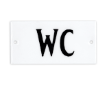 Strömshaga plåtskylt i emaljfinish med texten "WC" 4,5 x 9cm. Två alternativ för upphängning; antingen med medföljande dubbelhäftande etikett eller med spik i skyltens två hål.