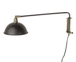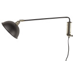 Vägglampa i svart metall med vinklingsbart huvud och dekorativa mässingsdetaljer. Svart textilsladd med strömbrytare och stickpropp. Mässingsfärgat väggfäste.