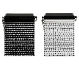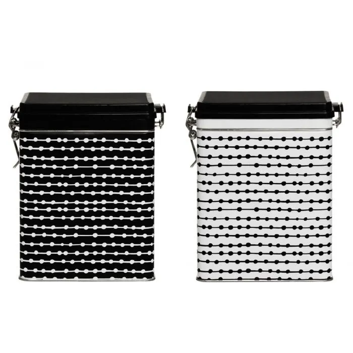 Snygg kaffekanna i metall med svartvitt mönster. Kaffet håller sig färskt längre när det förvaras i en lufttät plåtburk. Design av Hannele Kiviniemi.