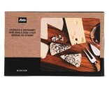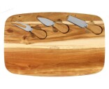 En träbricka i akacia med itegrerad kniv för mjuka och medelhårda ostar, en parmesankniv och en gaffel.