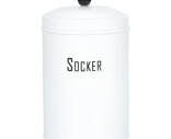 Rund plåtburk i vitt med texten Socker ur vår populära serie Svarte Petter. Lock med svart knopp. Matcha gärna med plåtburken för Mjöl i samma serie.