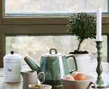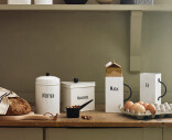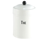 Liten rund plåtburk i vitt med texten Thé ur vår populära serie Svarte Petter. Lock med svart knopp.
