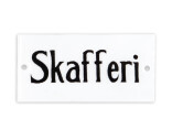 Strömshaga plåtskylt i emaljfinish med texten "Skafferi" 4,5 x 9cm. Två alternativ för upphängning; antingen med medföljande dubbelhäftande etikett eller med spik i skyltens två hål.