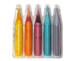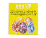 Förpackningen innehåller 5st flytande färger (gul, orange, purpur, turkos och lila), skyddshandskar, silvereffektpapper samt bruksanvisning.Färgerna är lämpliga för livsmedel.