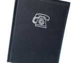 Svart A6 adressbok med index för adresser och telefonnumror.