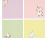 Moomin häften med pastellfärgade omslag, fyra olika bilder.