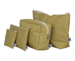 Necessär i prickigt gult tyg med dragkedja.
